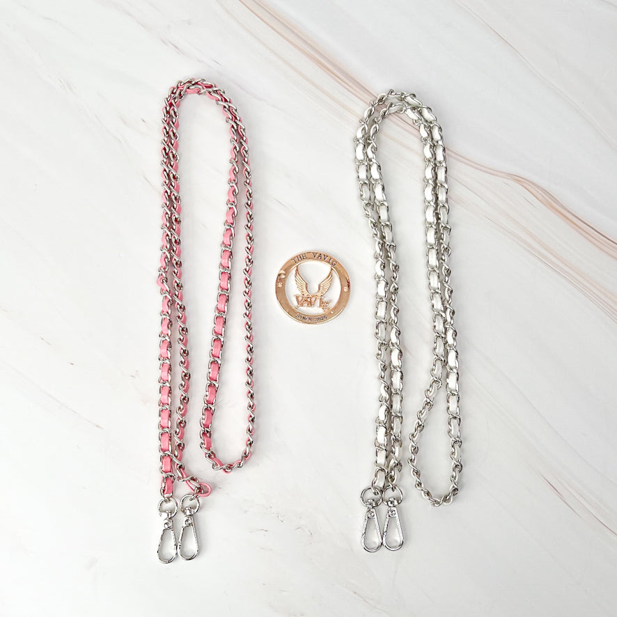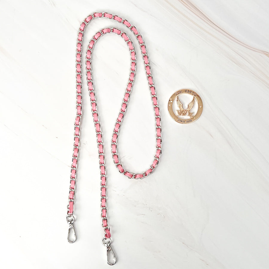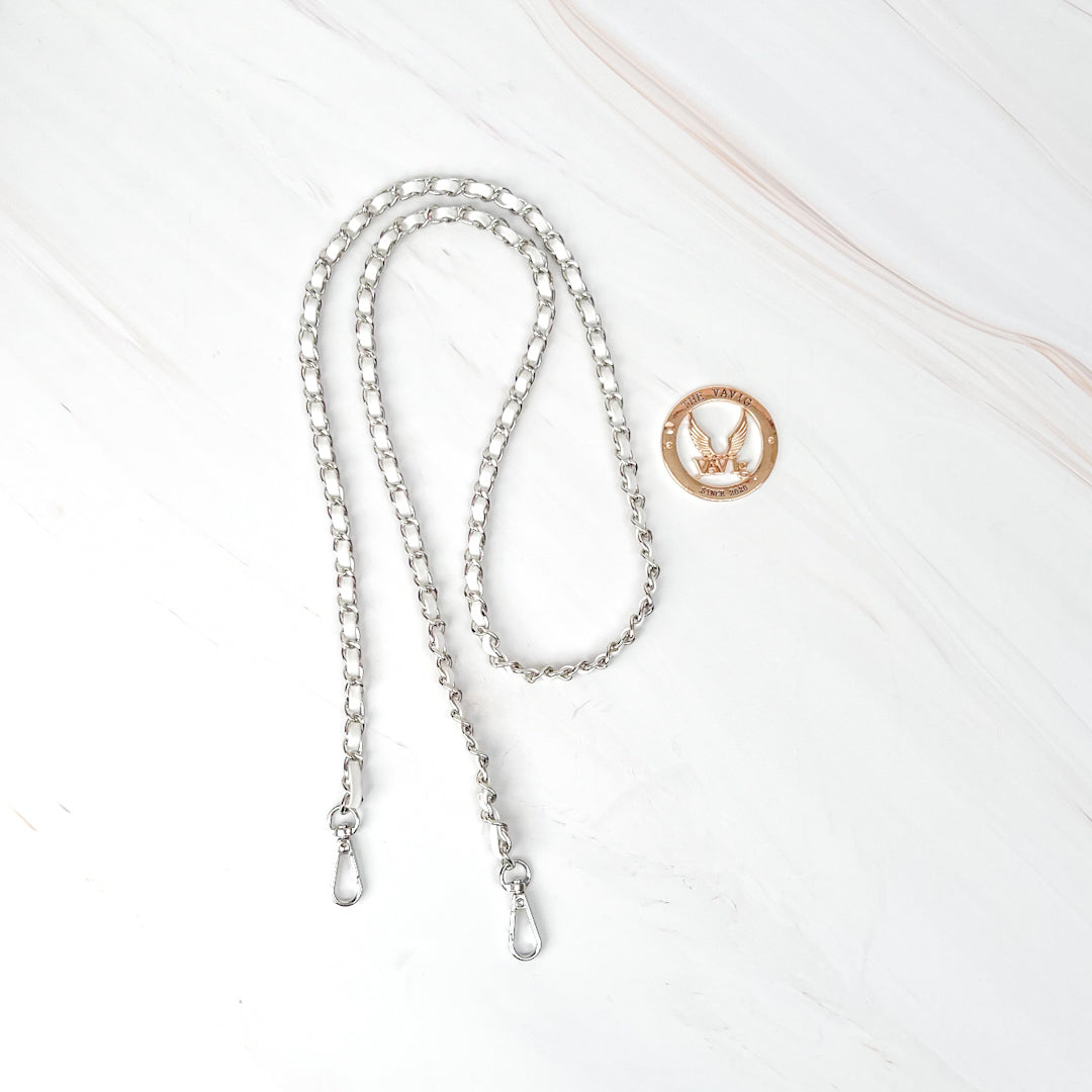 Añade elegancia y comodidad a tus bolsos con nuestra cadena de 1.23 m con detalle de vinipiel en color plata. ✨